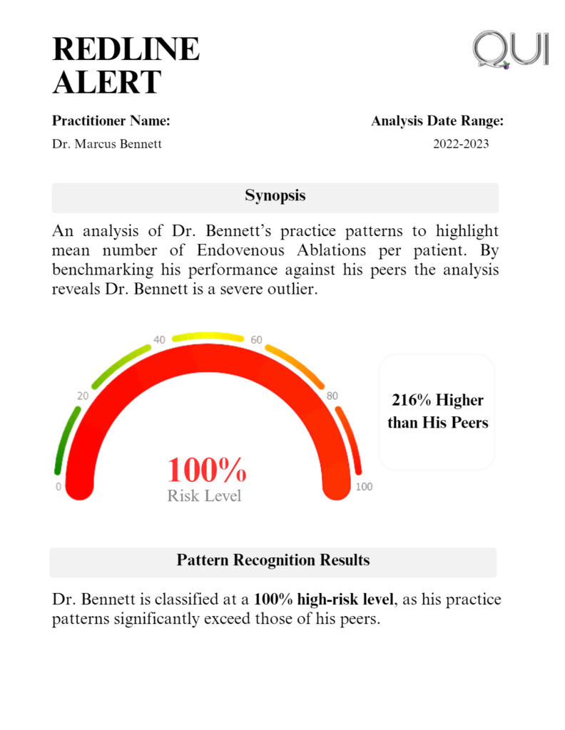 Identified a Nurse Practitioner in Phoenix who applied $176 million in ultra-expensive CTP to every patient. His practice ranked 21.5 standard deviations from the norm. QUI’s Redline Alert flagged his behavior as extreme.